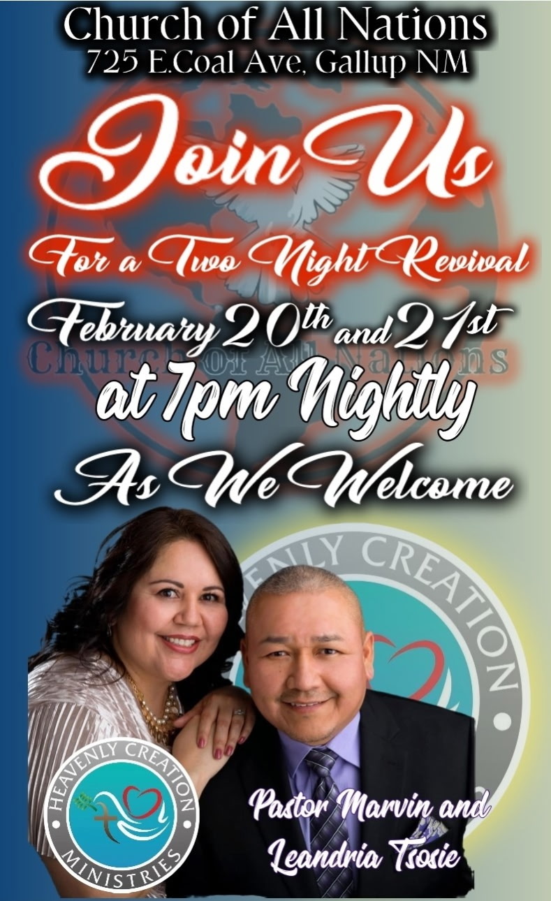 Join us for a 2 night revival in Gallup, NM, with Pastor Marvin and Prophet Leandria Tsosie, as they deliver the Word of God and spirit filled music.